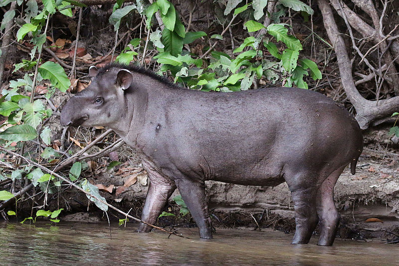 The Brazilian, or South American, tapir is one of five species in the tapir family. They are large mammals– adults can weigh between 330 and 710 pounds. They prefer to live near water, and are found in the Amazon Rainforest and Amazon Basin, east of the Andes. They are an herbivore that feeds on leaves, buds, shoots, small branches, fruit, grasses, and aquatic plants.