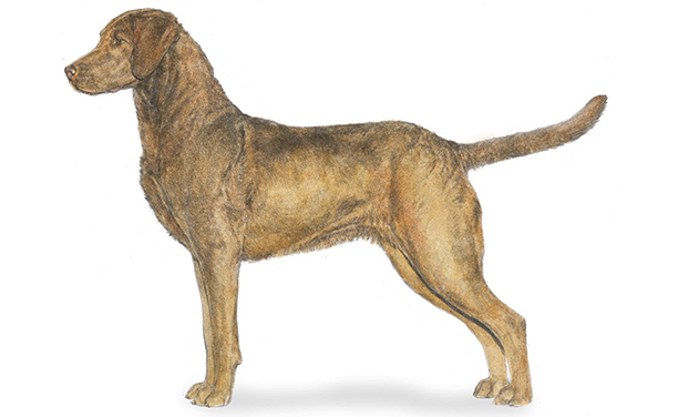 The powerful, driven Chesapeake Bay Retriever is a truly American breed, developed along the Chesapeake Bay, and honored as the state dog of Maryland. In 1807, two Newfoundlands were recovered from a shipwreck off the coast of Maryland and were bred to local retrievers that included the English Otter Hound and Flat- and Curly-Coated Retrievers. From these breedings the “Chessie” type of retriever was developed and these hardworking dogs were used to hunt and retrieve waterfowl in turbulent, icy waters, sometimes bringing in hundreds of birds in a day! They were kept warm and dry by their distinctive double coat consisting of a short, wavy harsh outer layer that covers a dense, fine, wooly undercoat. Chesapeakes are happy, energetic dogs that thrive on human companionship and love nothing more than having adventures with an active, outdoor-loving family. Their coat, while short, benefits from frequent brushing to distribute their natural skin oils that protect their coat in harsh conditions.