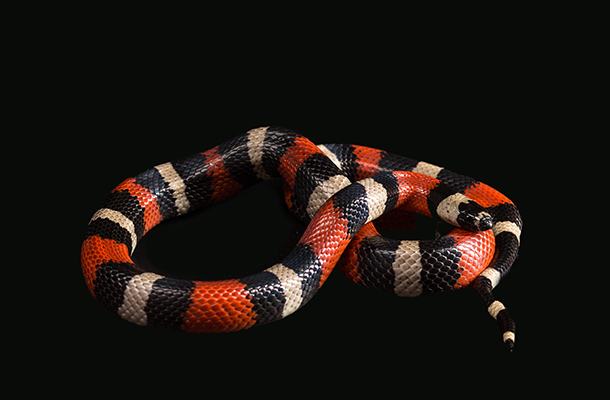 Milk Snakes (Lampropeltis triangulum) are found from Canada and the eastern U.S. all the way south to Venezuela. They are found in forested areas as well as in some prairies and rocky landscapes. They usually grow from 2’-5’ depending on their species and live for 10-20 years. Species can vary greatly in appearance, with even the same species being highly variable across its range. In captivity, you can find a variety of morphs, or different colors and patterns. Nearly all have spectacular bands of alternating colors that set them apart, but that also can cause erroneous identification as venomous coral snakes. For coral snakes, remembering the sayings “Red touches black, you’re OK Jack” or “Red touches yellow, you’re a dead fellow” help keep encounters in the wild from going very badly. They are also sometimes confused with massasauga rattlesnakes because of the segmented coloring. Milk snakes are harmless pets, though. They are nocturnal and are known to be very good at slipping out of inappropriate caging. Their environmental needs are moderate, with temperatures on the warm end of the cage recommended at 84-90 degrees, with 70-75 degrees on the cool end. Lighting cycles of 12 hours on, 12-off are suggested. Clean water should be available at all times. Adults should be kept in cages with a footprint of at least 30" x 12", but larger specimens of some species will require more room. They are among the most popular snakes for beginning herpers.